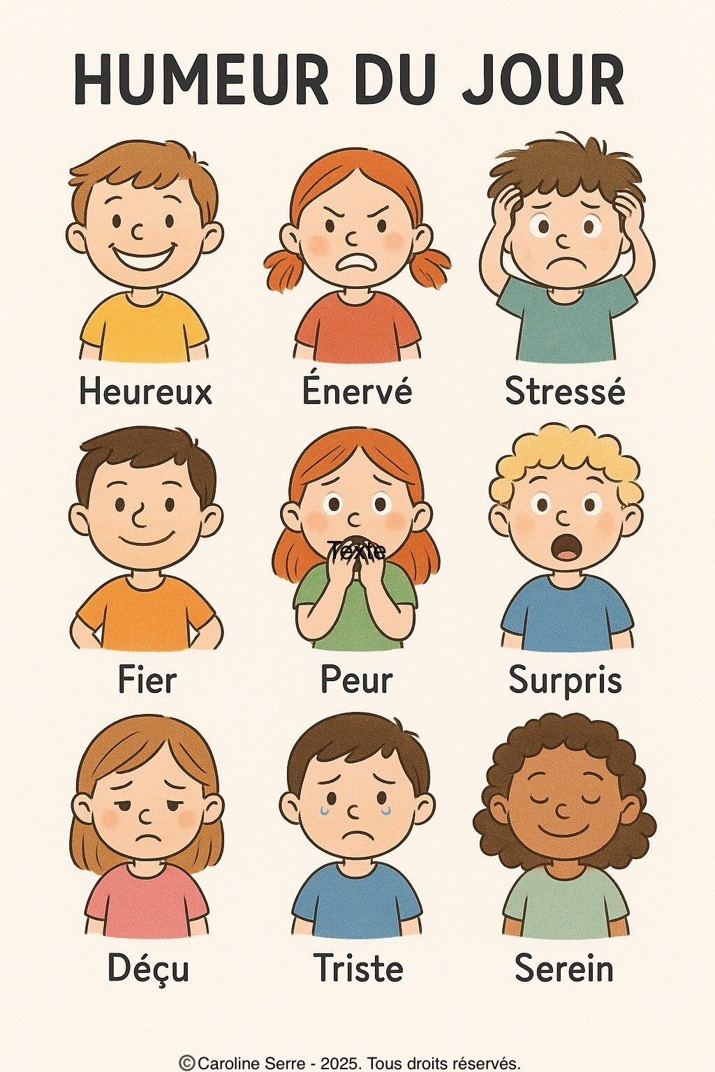 Avec ces 2 affiches, on fait le point sur l’humeur du jour, on apprend à repérer son émotion, on fait une pause.